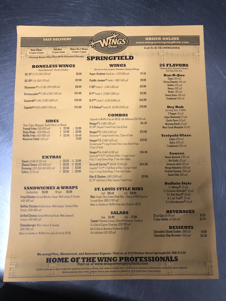 Introducing the menu at Wings Over Springfield, a renowned fast-food spot specializing in chicken wings and sandwiches, offering a range of options for all taste preferences. Located at 1219 Parker St Springfield, MA 01129, this establishment provides excellent delivery and takeout services, making it convenient for customers. With a diverse menu and a variety of flavors to choose from, such as Garlic Parm and Hot Garlic, Wings Over Springfield ensures a delightful dining experience. Customers rave about the quality of the food, quick service, and friendly staff, making it a must-visit destination for wing lovers in the Springfield area. Whether you're in the mood for boneless honey BBQ wings or spicy Cajun flavors, Wings Over Springfield delivers consistently delicious dishes that will leave you craving more. Don't miss out on this gem for a satisfying and flavorful meal.